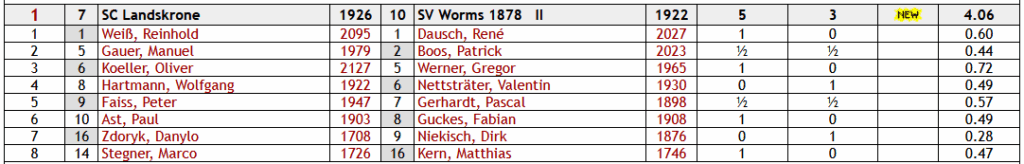 Die Niederlage von Wolfgang Hartmann, der mit Weiß seine Eröffnung suboptimal behandelt hatte und sich die ganze Partie nicht befreien konnte, war danach zu verschmerzen. Dafür konnte Manuel Gauer am 2. Brett sein etwas schlechteres Endspiel recht souverän halten und mit seinem Remis den Endstand von 5 : 3 klarmachen.