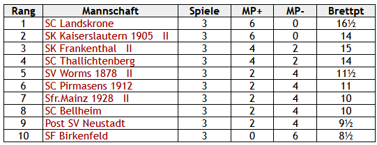 Mit diesem dritten Sieg in Folge konnten wir die Tabellenführung in unserer Liga verteidigen. Nur die 2. Mannschaft des SK Kaiserslautern ist auch noch verlustpunktfrei, hat aber 1,5 Brettpunkte weniger, wie die folgende Tabelle zeigt,
