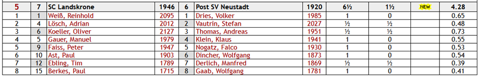 Dann ging es Schlag auf Schlag und der Wettkampf war für Landskrone entschieden. Am 4. Brett hatte Manuel Gauer im Mittelspiel eine Qualität erobert und sein Gegner setzte alles auf einen Verzweiflungsangriff, der aber außer großen Materialverlusten nichts einbrachte. Fast zeitgleich konnte Peter Faiss am 5. Brett seinen Bauernvorteil im Endspiel verwerten, so dass bereits mit dem Zwischenstand von 5 : 1 die Mannschaftspunkte gesichert waren.