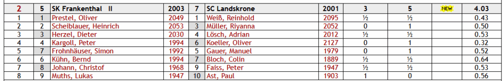 Kurz darauf remisierte auch Adrian seine Partie am 3. Brett, bei der nie das Stellungsgleichgewicht gestört war, nachdem Adrian in der Eröffnung auf einen Widerlegungsversuch der etwas zweifelhaften Eröffnung seines Gegners verzichtet hatte. Damit Zwischenstand 3 : 2.